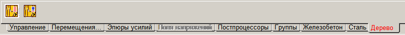 В настоящей версии программы предусмотрен анализ стержней из цельной или клееной древесины прямоугольного, круглого или тавровое сечение. Сечения задаются как параметрические или формируются с помощью программы Конструктор сечений. Управление операциями ввода исходных данных и анализа несущей способности сечений в элементах деревянных конструкций выполняется из раздела инструментальной панели Дерево. Элементы управления указанными операциями сосредоточены в двух инструментальных панелях:
