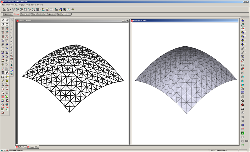 Схема описана зависимостью z = (1 – x2 /20 – y2 / 20) / 2 при следующих значениях характеристик: Хнач= -10 м; Хкон = 10 м; Nx = 10; Yнач =-10 м; Yкон = 10 м; Ny = 10. Полученные в результате расчетные схемы (слева из стержневых элементов, справа из элементов оболочки) изображены на рис. 1.