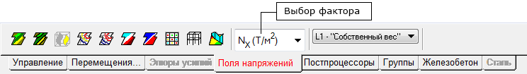 Управление отображением результатов расчета силовых факторов для двумерных элементов выполняется из инструментальной панели Поля напряжений (рис. 1). Для этого используются следующие кнопки: