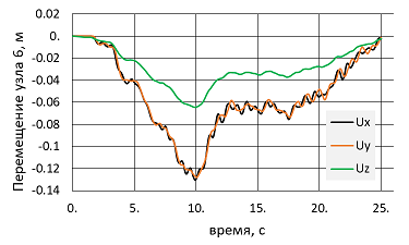 Рис. 10. Перемещения узла 6 во времени. Упругое основание