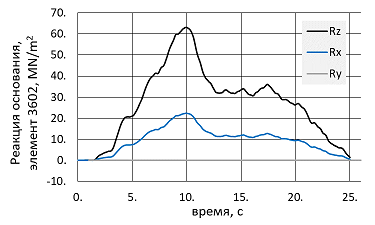 На рис. 11 показаны реакции Rx, Ry и Rz неупругого основания, а на рис. 12 – реакции Rx, Ry и Rz упругого основания конечного элемента 3602, расположенного в центре фундаментной плиты. В случае упругого основания величины всех трех реакций оказались близки, поэтому на соответствующем графике видна одна кривая. Максимальное значение реакций Rx и Ry для упругого основания оказались более чем в два раза большими, чем для неупругого.