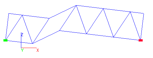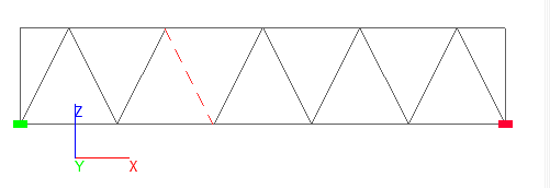 Пример. Расчетная модель плоской фермы представлен на рисунке 1. Отсутствующий раскос показан красной прерывистой линией. Форма колебаний, соответствующая нулевой частоте, показана на рисунке 2. Начальный сдвиг принят равным -0.001 Гц.