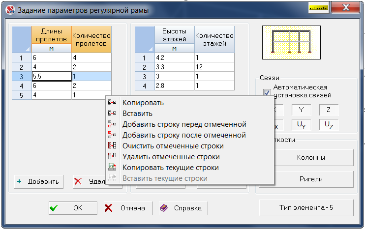 Для ввода табличной информации в диалоговых окнах используются универсальные таблицы. Операции с данными, представленными в табличном виде, выполняются с помощью набора команд (рис. 1), вызываемого нажатием правой кнопки мыши при размещении курсора в поле таблицы (рис. 2).