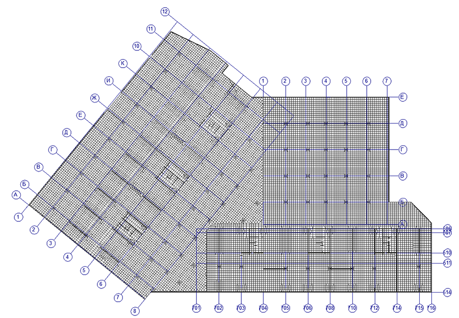 Расчетную схему или ее часть можно формировать, используя для этого сетку координационных (разбивочных) осей. В программе предусмотрена возможность задания разбивочных осей, состоящих из нескольких участков, каждый из которых может иметь один из четырех типов: прямоугольный, прямоугольный, повернутый на заданный угол, косоугольный или полярный. Вертикальные отметки являются общими для всех участков и задаются один раз при описании первого участка.