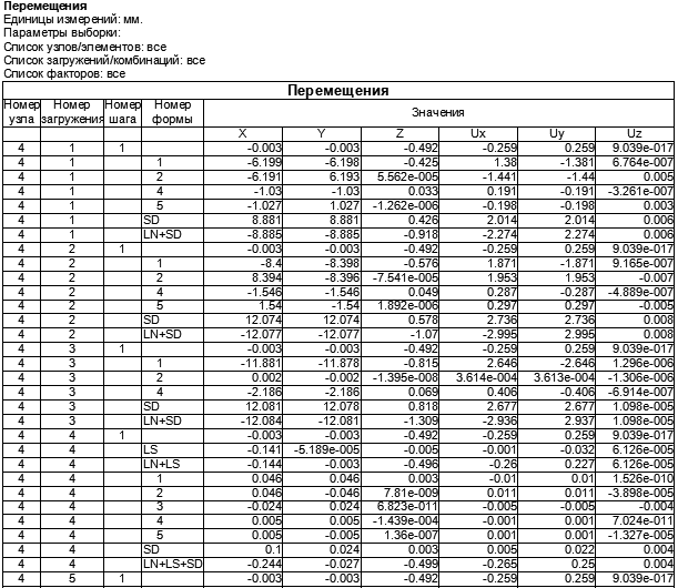 На рис. 1 приведен фрагмент таблицы перемещений для нелинейной задачи, таблица сформирована Документатором.