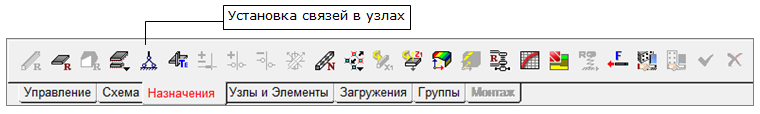 Для установки связей используется одноименная операция в разделе Назначения инструментальной панели (рис. 1). После нажатия кнопки Установка связей в узлах появляется диалоговое окно Связи, в котором путем активации маркеров отмечаются направления перемещений, на которые накладываются связи. Следующий порядок действий является стандартным — закрыть диалоговое окно (кнопка OK), выбрать с помощью одного из курсоров узлы, в которые устанавливаются связи, и нажать кнопку OK в инструментальной панели Назначения или клавишу Enter на клавиатуре.