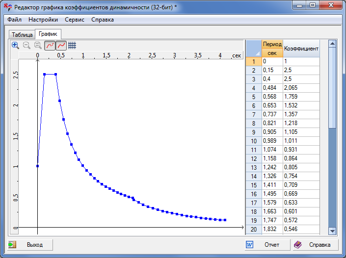 Кнопки оформления позволяют включать или отключать отображение сетки, а также вывод точек, на основании которых построен тот или иной график. Как правило, рядом с графиком расположена таблица с численным представлением тех же данных.