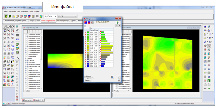 Если пользователь открыл несколько расчетных схем и в одной из них (или в нескольких) активированы диалоговые окна (например, диалоговое окно цветовой шкалы), то для того, чтобы разобраться к какой именно расчетной схеме относится информация в диалоговом окне, достаточно подвести курсор к заголовку диалогового окна. При этом появится всплывающая подсказка с именем файла, к которому относится информация (см. рис. 2).