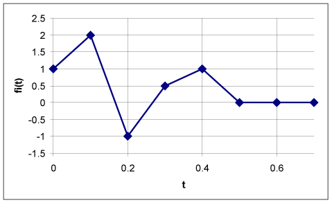 На рис. 1 изображена приведенная в таблице зависимость φp(t) для моментов времени t ≤ 0.7. Если шаг интегрирования не совпадает с моментом времени, в котором задана функция времени, по умолчанию выполняется линейная интерполяция. Это следует принимать во внимание при задании нагрузок, быстро осциллирующих во времени.