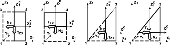 Положительные направления NX и NZ растягивают сечения балки-стенки, проведенные через центр тяжести элемента перпендикулярно осям X1 и Z1, соответственно. Направление напряжений принято для той части сечения, к которой принадлежит последний из основных (3-й — для треугольных либо 4-й — для четырехугольных) узлов, т. е. определяется воздействие отброшенной (с узлом 1) части на оставшуюся (с узлами 3 либо 4) часть элемента. |
