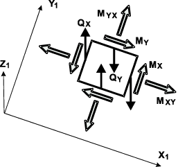 Положительные моменты MX, MY, MXY растягивают нижние (по отношению к направлению оси Z1) волокна сечений, проведенные через центр тяжести КЭ перпендикулярно осям X1, Y1, соответственно. Направление усилий MX, MY, MXY, QX, QY принято для той части сечения, к которой принадлежит последний из основных (3-й для треугольных либо 4-й для четырехугольных) узлов элемента, т. е. определяется воздействие отброшенной (с узлом 1) части на оставшуюся часть. Положительное направление перерезывающих сил QX и QY совпадает с направлением оси Z1. |