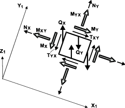 MX — изгибающий момент на единицу длины сечения (Тм/пог. м), положительный MX сжимает верхние (по отношению к направлению оси Z1) и растягивает нижние волокна сечения в направлении, параллельном оси X1;