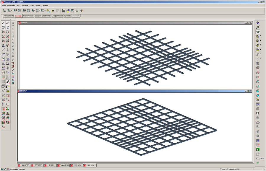 Для формирования расчетной схемы балочного ростверка предусмотрена соответствующая операция в разделе Схема. Исходные данные для этого вида схем задаются в одноименном диалоговом окне аналогично рассмотренным ранее параметрическим прототипам. В двух таблицах диалогового окна задаются шаг и количество шагов ростверка вдоль осей X и Y соответственно. Жесткостные характеристики элементов (кнопка Жесткость) и их тип (кнопка Тип элемента) назначаются аналогично одноименным операциям при генерации параметрических прототипов рам.