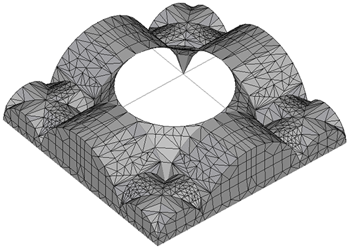 В комплексе реализован импорт файлов в формате системы Autodesk 3D Studio Max (расширение .3ds), что позволяет получить геометрию расчетных схем оболочечных конструкций или их фрагменты. Указанная система может быть с успехом использована для генерации геометрических моделей сложных пересекающихся поверхностей, которые импортируются в SCAD в виде трехмерной сетки трехузловых элементов оболочки (рис. 1).