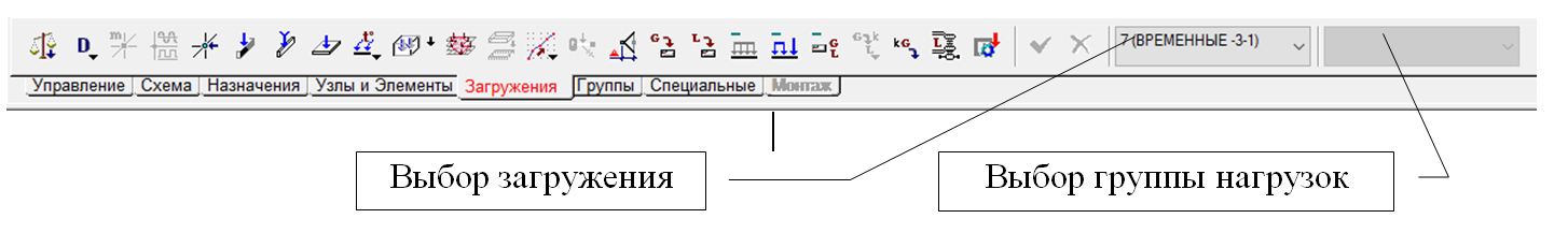 В этом разделе рассматриваются операции задания нагрузок и формирования схем загружений для выполнения статического и динамического расчетов. Управление операциями сосредоточено в разделе Загружения инструментальной панели (рис. 1).