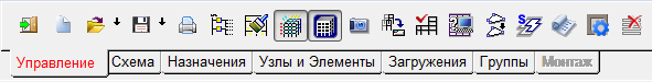 Работу по созданию нового проекта начинают с формирования расчетной схемы. Для этого следует установить курсор на раздел Расчетная схема в Дереве проекта и нажать левую кнопку мыши. Управление будет передано графическому препроцессору, в котором и выполняется формирование расчетной схемы. Инструментальная панель препроцессора содержит различные операции создания геометрии схемы, назначения граничных условий, нагрузок и др. После старта препроцессора в инструментальной панели активен раздел Управление (рис. 1).