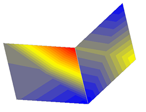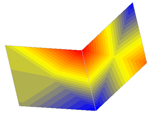 Параметр Критерий пологости оболочки позволяет различать два случая, схематически представленные на рисунках 1 и 2. В первом из них малы двухгранные углы между конечными элементами, образовавшиеся при замене гладкой поверхности оболочки многогранной конструкцией из плоских конечных элементов. При определении значений напряжений в узлах вполне допустимо использование осреднения данных, взятых из всех конечных элементов, примыкающих к узлам (предполагается, что направления выдачи усилий в этих элементах заданы корректно). Во втором случае, когда рассматривается угол здания, двухгранный угол между стенами велик. В этом случае поля напряжений следует строить раздельно для каждой стены. Тогда усреднение в узлах будет выполняться для каждой стены в отдельности.