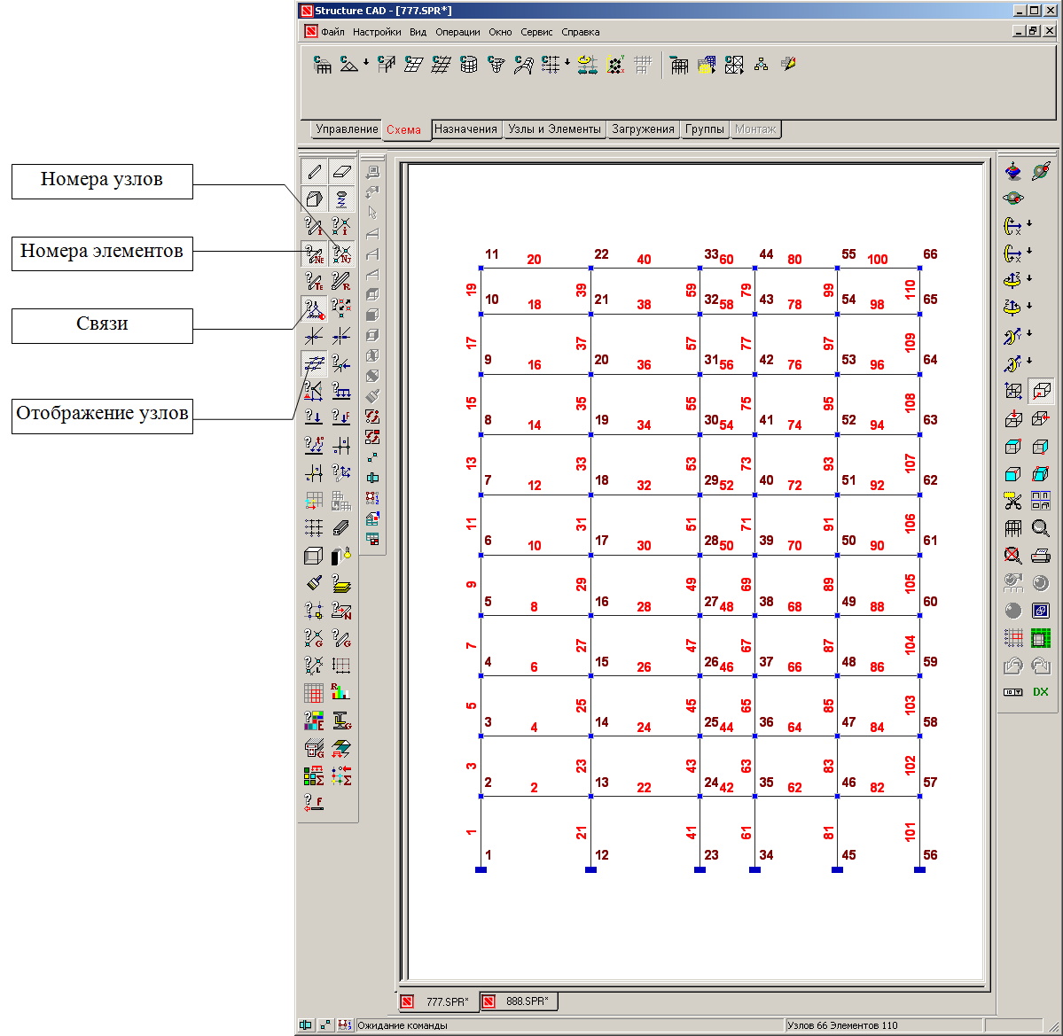 Кнопки Колонны и Ригели служат для ввода жесткостных характеристик соответствующим элементам схемы, а кнопка Тип элемента — для назначения типов конечных элементов. Эти данные задаются с помощью соответствующих операций в инструментальной панели Назначение и описаны в разделе Задание характеристик узлов и элементов.