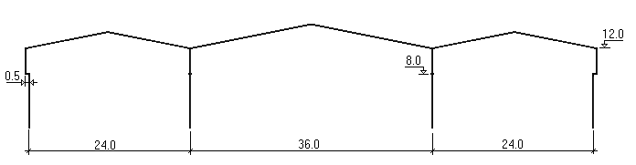 В качестве примера одноэтажной многопролетной рамы рассмотрим раму с двухскатными симметричными ригелями (рис. 1), имеющую три пролета (24 м, 36 м и 24 м) и высоту колонн 12 м, уклон ригелей 20%, отметка привязки подкрановой балки 8 м и величина смещения осей подкрановой части относительно надкрановой — 0.5 м.