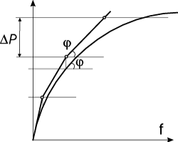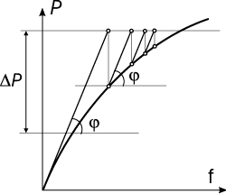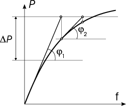 В простом шаговом методе (рис. 1) на каждом шаге ΔР решается линеаризованная задача и в предположении, что это решение является достаточно точным, реализуется переход к следующему шагу нелинейного загружения. Погрешность решения нелинейной задачи не контролируется, количество шагов задается пользователем. При этом жесткость линеаризованной системы (тангенс угла наклона φ) принимается без учета невязки в усилиях. Шаговый метод с уточнениями предусматривает итерационное уточнение нелинейной нагрузки на очередном шаге ΔР за счет учета невязки в уравнениях равновесия. При этом итерации выполняются с неизменным значением линеаризованной матрицы жесткости (рис. 2), которая была вычислена в начале очередного шага (угол φ остается неизменным на шаге). Наконец, в шагово-итерационном методе (рис. 3) производится итерационное уточнение решения на каждом шаге ΔР с корректировкой линеаризованной матрицы жесткости на каждой итерации (угол φ меняется внутри шага). Шаговый процесс имитирует поведение системы при увеличивающейся (уменьшающейся, если значения коэффициента загружения отрицательны) интенсивности нагрузок, действующих на систему. При этом предполагается, что все компоненты нагрузок, относящиеся к указанному загружению, увеличиваются (уменьшаются) одновременно в одной и той же пропорции. |