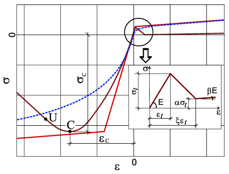 \[ \sigma ( \varepsilon)=\left\{ \begin{array}{ll} E\varepsilon ,\quad 0\le \varepsilon \le \varepsilon_{t} , \\ \alpha\sigma_{t} +\frac{\left( {1-\alpha } \right)E}{1-\xi }\left( {\varepsilon -\xi \varepsilon_{t}} \right),\quad \varepsilon_{t} \le \varepsilon \le \xi \varepsilon_{t} ,\xi >1,\\ \alpha \sigma_{t} +\beta E(\varepsilon -\xi \varepsilon_{t}),\quad \varepsilon >\xi \varepsilon_{t} , \\ {\frac{\frac{E}{E_{r} }\varepsilon_{r} \sigma_{c} }{1+A\varepsilon_{r} +B\varepsilon_{r}^{2} +C\varepsilon_{r}^{3} },\quad \varepsilon_{u} \le \varepsilon \le 0 } \end{array} \right. \]