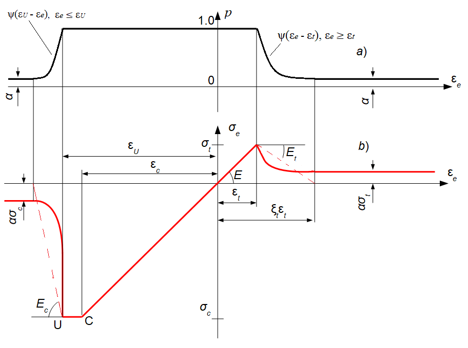 Если маркер Учет деградации бетона включен, поверхность текучести остается замороженной, а для моделирования деградации бетона при растрескивании используются элементы механики разрушения. На рис. 3 (a) изображена зависимость параметра p от приведенной деформации εe, а на рис. 3 (b) – примерный вид диаграммы σe – εe, получаемой из расчета. Точки C, U соответствуют одноименным точкам диаграммы ЕКБ (рис. 2).