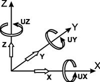 Положительные направления линейных перемещений совпадают с направлением соответствующих осей X, Y, Z (рис. 1). Для угловых перемещений UX, UY, UZ в качестве положительного принят поворот против часовой стрелки вокруг соответствующей оси, если смотреть с ее конца. |