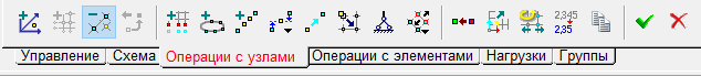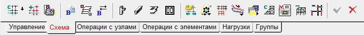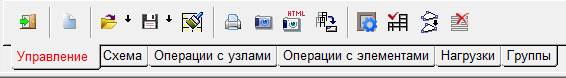 Инструментальная панель содержит разделы: Управление, Схема, Операции с узлами, Операции с элементами, Нагрузки и Группы. Переключение разделов выполняется указанием курсора на «закладки» с наименованиями разделов.