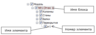 Дерево имеет многоуровневую структуру и включает следующие уровни представления модели: модель, блок, группа элементов, элемент. Группы элементов могут быть пяти видов: колонны, стены, балки, перекрытия, крыши. Управление деревом выполняется с помощью двух видов кнопок-маркеров вида а и б.