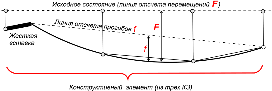 Линией отсчета прогибов считается прямая, которая соединяет начало и конец гибкой части конструктивного элемента. Ниже на рисунке показан пример, в котором конструктивный элемент состоит из трех конечных элементов.