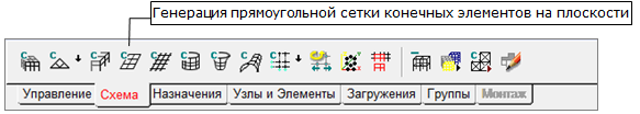 — Генерация прямоугольной сетки конечных элементов на плоскости, расположенной в разделе Схема инструментальной панели (рис. 2).