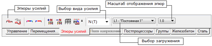 Для отображения эпюр усилий в одноименной инструментальной панели (рис. 1) можно воспользоваться следующими операциями: