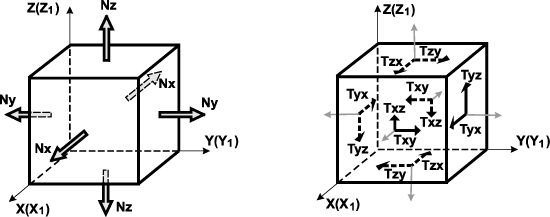 На рис. 2 показаны положительные направления напряжений, наименования осей, вдоль которых они направлены, и плоскостей, в которых они действуют. В таблице 1 приведены правила чтения результатов, причем в скобках даны обозначения парных напряжений. По умолчанию для элементов типов 31, 33 и 35 напряжения рассматриваются относительно местной системы координат X1Y1Z1, а для элементов типа 32, 34, 36, 37 и 38 — относительно глобальной системы координат XYZ.